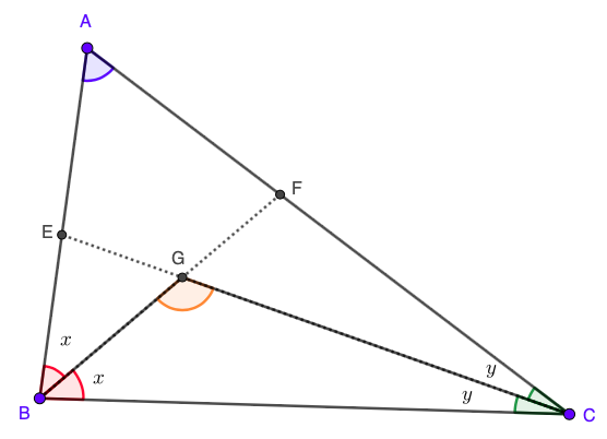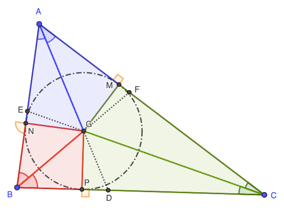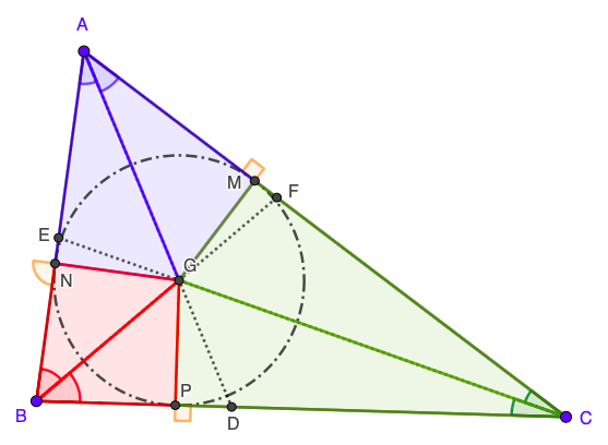 Por uma questão de simplificação, vamos convencionar que ângulos de mesma cor têm a mesma medida. Sabendo que tangentes comuns traçadas de um mesmo ponto a uma circunferência são iguais, o incentro de um triângulo é o centro do círculo inscrito no mesmo triângulo.