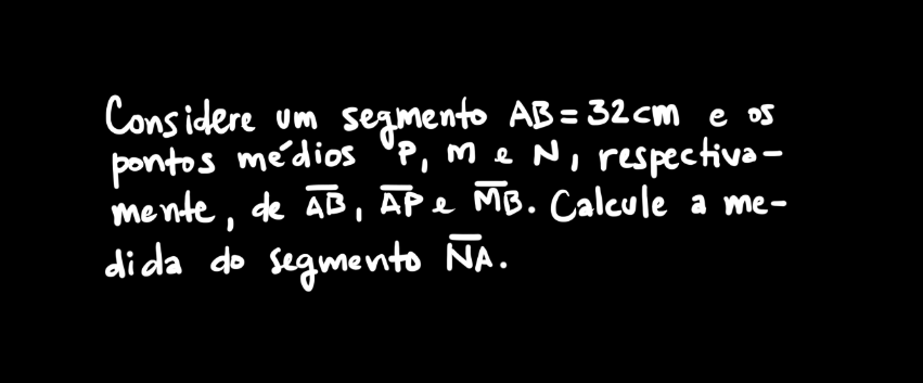 Olá, hoje trago um problema proposto como dúvida por uma aluna. O problema envolve apenas o conceito de ponto médio de segmentos e as medidas de alguns segmentos adjacentes. O enunciado não traz a figura e, por isso, desenhar uma boa figura já ajuda em boa parte para resolver o problema.