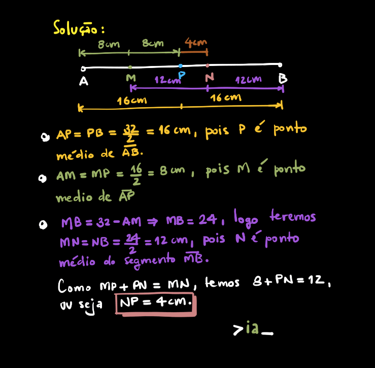 Antes de ver a solução, tente resolver sozinho. O conceito de segmento de reta é simples e faz parte do início do estudo da geometria plana. É importante para formular e resolver problemas e ajuda em várias áreas como, por exemplo, trigonometria e/ou geometria analítica.