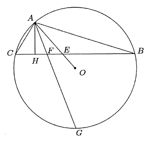 Considere um círculo de centro circunscrito a um triângulo com ângulo obtuso em . O raio forma um ângulo de com a altura e intercepta em um ponto . O prolongamento da bissetriz do ângulo intercepta em um ponto e a circunferência em um ponto , conforme figura abaixo.
