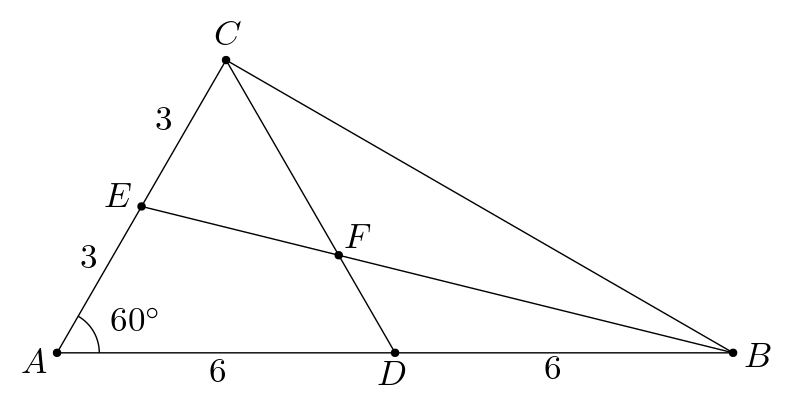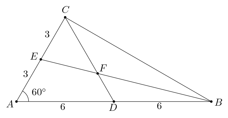 Vejamos, em primeiro lugar que e, por isso, . Então, o triângulo é equilátero e teremos . Para o triângulo , os segmentos e são medianas e, portanto, o ponto é baricentro de . Então, da propriedade do baricentro teremos . Se , teremos , logo . Opção A.