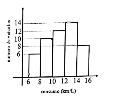 De acordo com o histograma, há veículos com autonomia de a km/L; veículos na faixa de a km/L e veículos de a km/L. O total de veículos na faixa de autonomia pedida é, então, de veículos. O total geral de veículos é de veículos. A porcentagem será de . Opção C.
