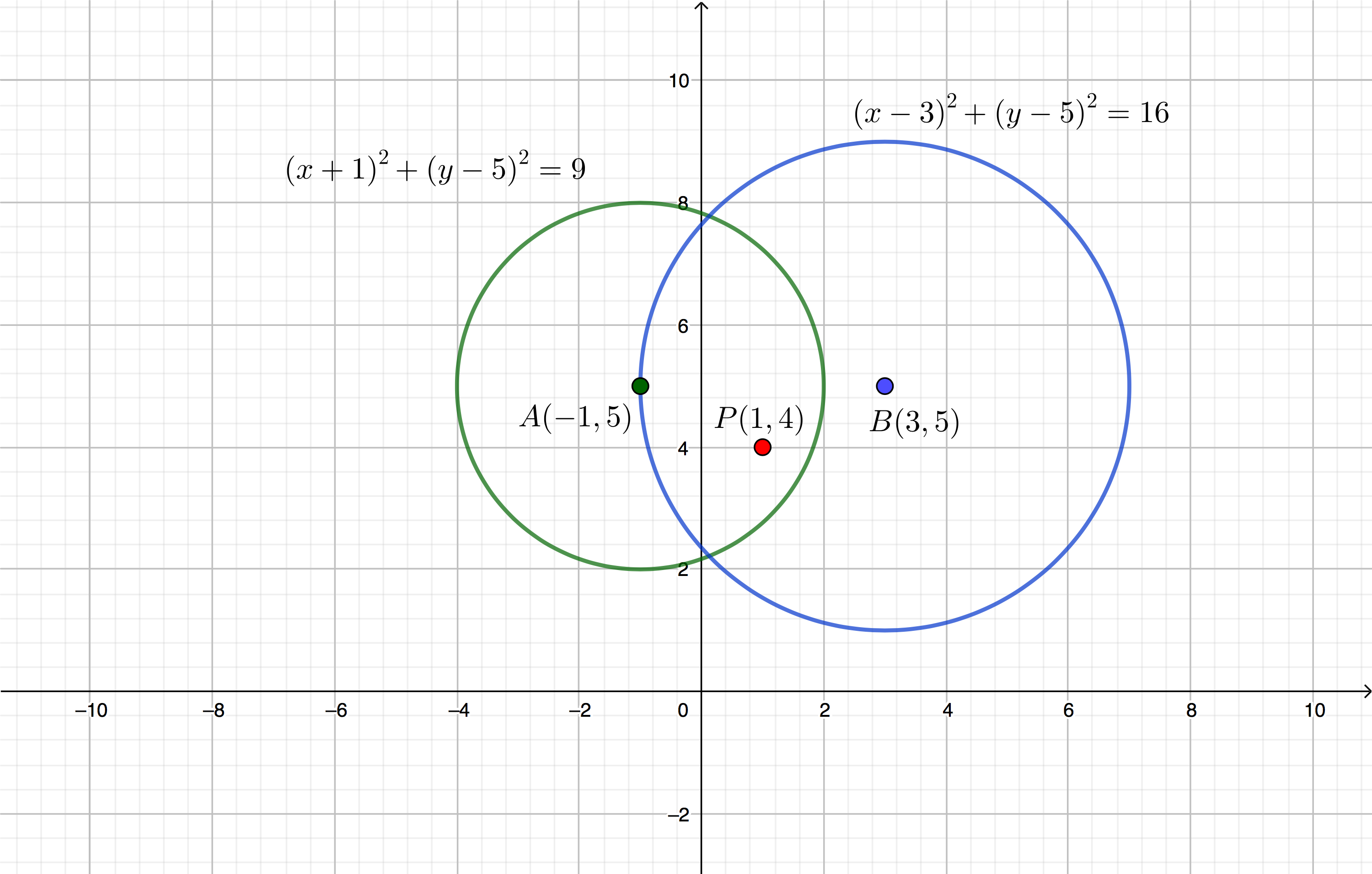 O ponto é à circunferência de equação e é à circunferência de equação .