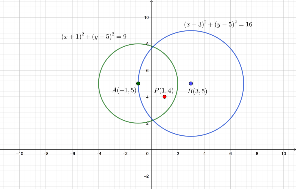 Para resolver este problema basta comparar a distância do centro de cada circunferência ao ponto dado com o raio da respectiva circunferência. Para isto, basta substituir o ponto na equação da circunferência. Para a primeira: