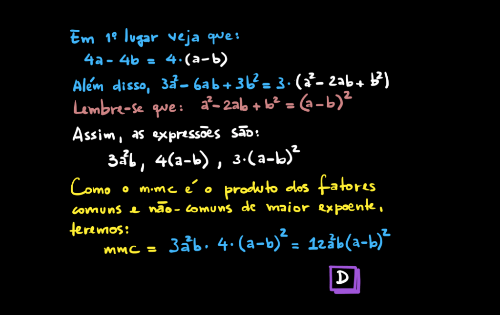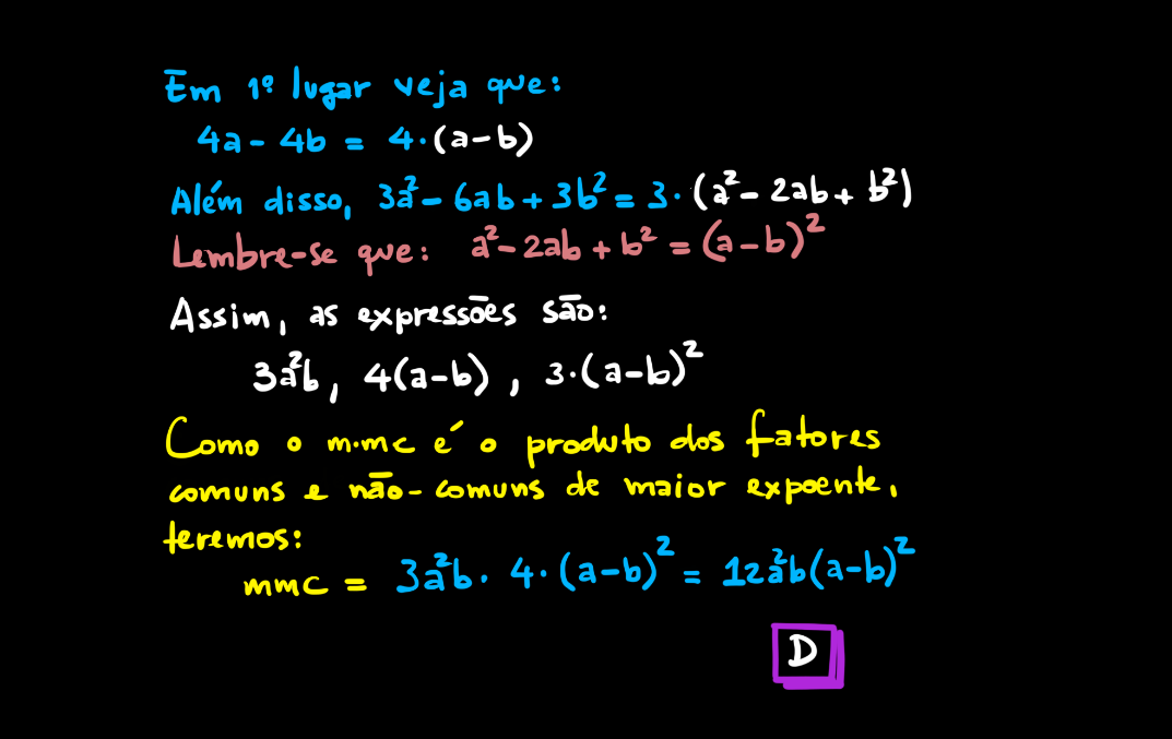 Veja que aparece também uma fatoração algébrica envolvendo o quadrado de uma diferença – que é um produto notável. Como falei, trata-se de uma questão simples (o que, via de regra nem sempre é fácil…), no sentido de que, conhecida a definição de MMC, o resto torna-se banal.